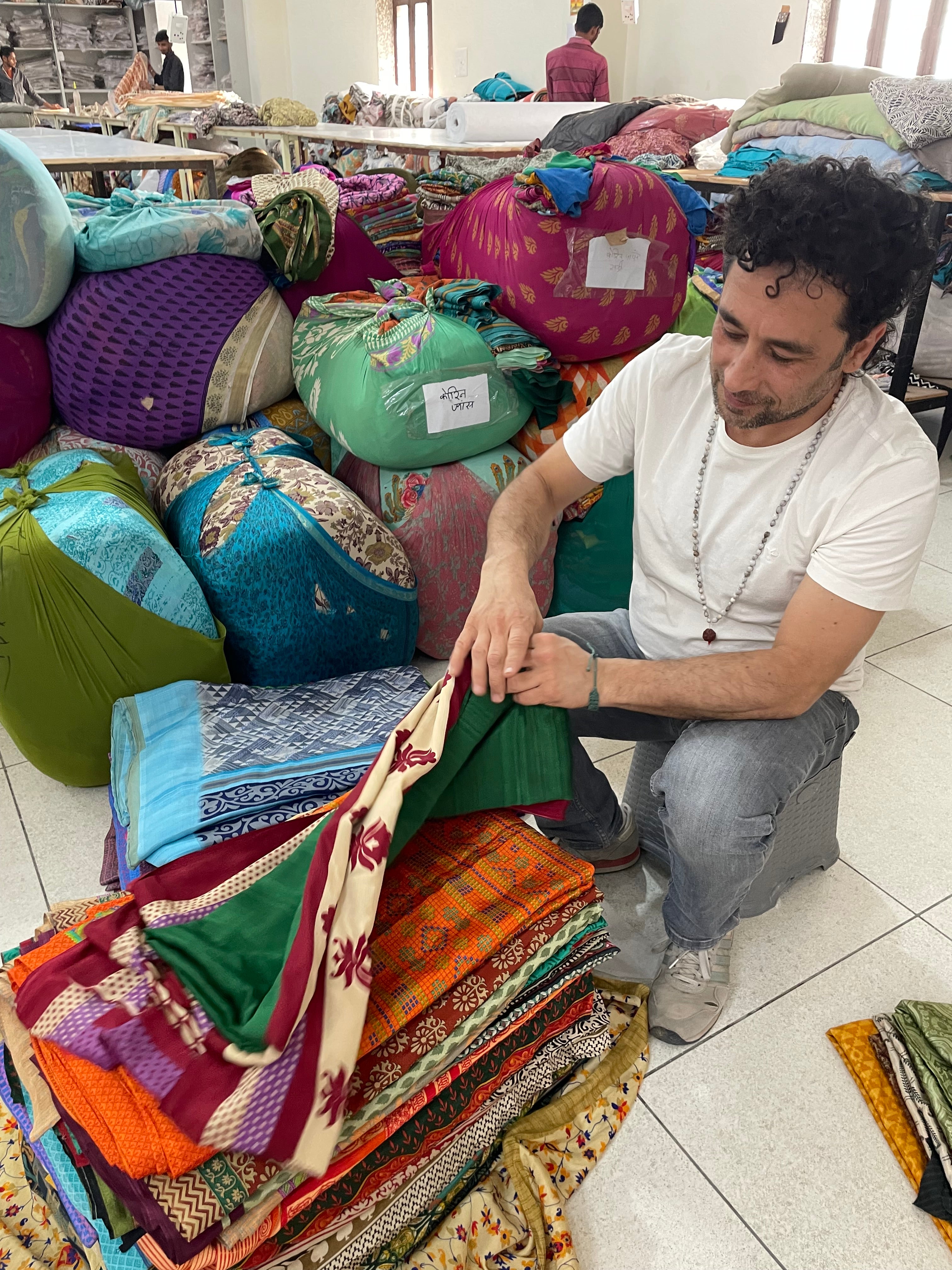 In Pushkar, the sacred village of Rajasthan, I reunited with the producers I had worked with many years ago. Their dedication and craftsmanship have only grown, and rekindling our collaboration felt like reuniting with family after a long separation. I dove into bundles of old saris, searching for the softest and most vibrant ones to craft a small summer collection. The familiar scent of old saris brought a wave of emotion. Yes, they have a distinct smell — a reminder of their rich history. I love working with